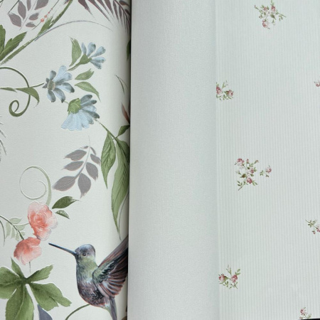 - Третий сет представляет собой ветви с хрупкими бутонами и листьями, среди которых парят райские колибри - все это передает изящность и изысканность вашему интерьеру. Мотив идеален для стиля прованс.